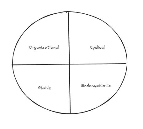 However this may or may not be addressed in the coming posts, the picture we are left with is the following one: namely, a ‘Cosmos’ which is composed of organizations, the basic structure of which is one of cycles, and that these organizations are both endosymbiotic and striving towards stability. As there are organizations in the Cosmos of different ‘kinds’, it becomes interesting and important to consider the many different events, cycles, entanglements, and ways of being stable are possible, both within and between organizations.