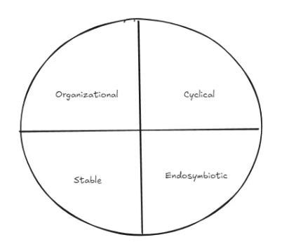 Namely, a ‘Cosmos’ which is composed of organizations, the basic structure of which is one of cycles, and that these organizations are both endosymbiotic and striving towards stability. As there are organizations in the Cosmos of different ‘kinds’, it becomes interesting and important to consider the many different events, cycles, entanglements, and ways of being stable are possible, both within and between organizations.