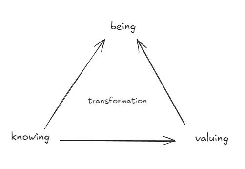 Considering these connections and framing is certainly one that stirs the mind; and it is not necessarily the case that one should look for a magical formula which can describe these connections, but just better ways to discuss and consider the entanglement of the three. And we might even say, considering this context, that to be and to value and to know is to perhaps to spur a transition, or at least engage with the notion of transition more genuinely.